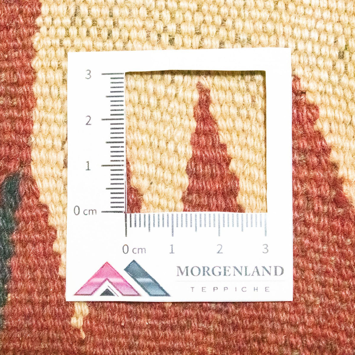 Questo tappeto è realizzato esclusivamente con lana di pecora filata a mano. La lavorazione manuale preserva le proprietà naturali della lana: è resistente, elastica e piacevolmente morbida al calpestio.