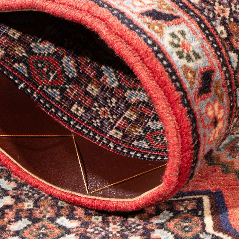 La alfombra Senneh está hecha a mano con materiales resistentes. Se tejió en la provincia de Kurdistán, al oeste de Irán, y es especialmente duradera y resistente. Su estampado detallado y su estructura resistente la convierten en un elemento perfecto para estancias muy frecuentadas, como el pasillo o el salón.