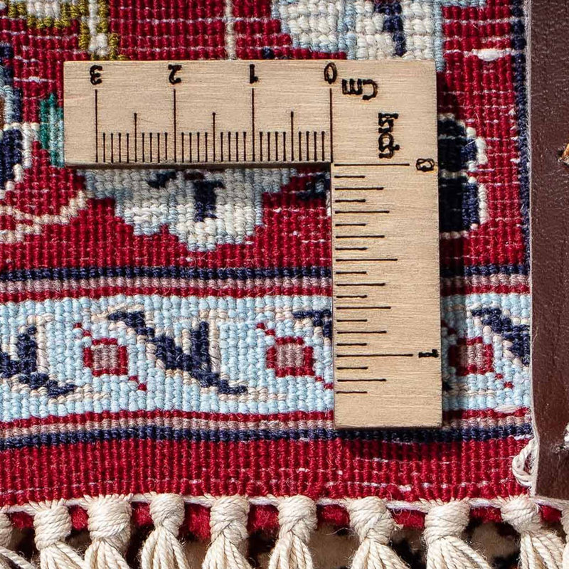 Esta alfombra persa - Isfahan - Premium lleva el lujo a su hogar. Esta alfombra está hecha 100% de seda y pertenece al nivel 4 de máxima calidad. Su densidad de nudos de aproximadamente 890.000 a 1.000.000 de nudos por metro cuadrado promete la mejor calidad y durabilidad. Las alfombras de Isfahan deben considerarse una artesanía exquisita. Isfahan es probablemente la ciudad más bella del Islam y esta alfombra es una parte importante de ella. Artísticos medallones, zonas con jarrones, pájaros o animales salvajes adornan la alfombra de Isfahan y la convierten en una de las más populares y, al mismo tiempo, en la alfombra persa de mayor calidad por su atención a los detalles, su alta densidad de nudos y su brillo sedoso. Los materiales de alta calidad son una cuestión de tradición. Por eso suele tener una urdimbre de seda. Incluso hoy, muchas alfombras de Isfahan tienen marcas anudadas en el borde. Puedes mirar una alfombra como ésta durante horas y olvidarte del tiempo, una experiencia que no se puede capturar en una foto.